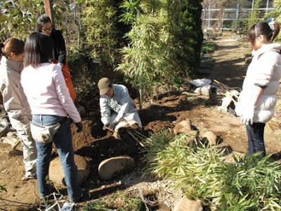 昨日から、E&Gデザイン土曜コースの「庭園制作」実習がスタート。この時期のデザインコースは、水曜日と土曜日、それぞれ別々のデザインで庭園制作を行います。水曜日は「坂井也寸志先生(坂井オフィス)」、土曜日は「林好治先生(林庭園設計)」が担当。両先生とも、独自の「庭園論」をお持ちで、休憩時間に、「仕事」のお話を聞けるのも、授業中の楽しみの一つです。「庭づくり」という「仕事」に「大切なこと」をランダムに教えてもらえる。 お二人に共通するのは、「お客様の立場になれば、無闇に儲けることはできない」という「職業観」。「良い庭を造る=薄利商売」。お二人に限らず、当校の先生方は、自分の仕事に対して、とにかく「ストイック」。学校で生徒に教えていただく姿勢も、全く一緒です。プロ意識の高さと仕事に対する自負。それは「多くの経験と実績」という根拠から導き出された「確定事項」であり、在学中に、先生方の「仕事に対する姿勢」を学べることは、「仕事の秘伝」を授けられているようなもの。事務局が「それを言っちゃぁおしまい」かもしれませんが、こんな、先生方に教えてもらえる、この学校、本当に良い学校だなと、埼玉高速鉄道に揺られながら、一人心地ていました。自画自賛も、偶にはお許しあれ。 さて、ここからが、今日の本題。上の写真は、林先生に「根巻き」のやり方を教わっているところ。掘り取った樹木を移植するために、根を保護する作業ですが、造園工事の「基本中の基本」。見ているだけだと、簡単そうに見えるのですが、縄の使い方など、一度や二度で習得できるものでは無く、「とにかく、自分でやってみる」ことが、実習授業の目的。